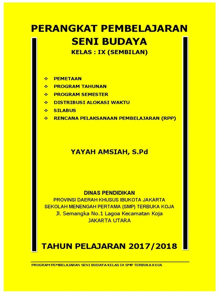 Download silabus seni budaya smp/mts kelas 7,8,9 kurikulum k13 sesuai dengan revisi terbaru untuk membantu bapak/ibu guru dalam . 2 2 dan / mapel seni budaya. Rencana pelaksanaan pembelajaran (rpp) adalah rencana kegiatan pembelajaran tatap muka untuk satu pertemuan . Rpp dan silabus seni budaya smp kelas vii, viii, ix lengkap kurikulum ktsp program semester (promes), program tahunan (prota), pemetaan, dan kkm. Buku seni budaya kelas 9 3 smp ktsp 2006 erlangga.
